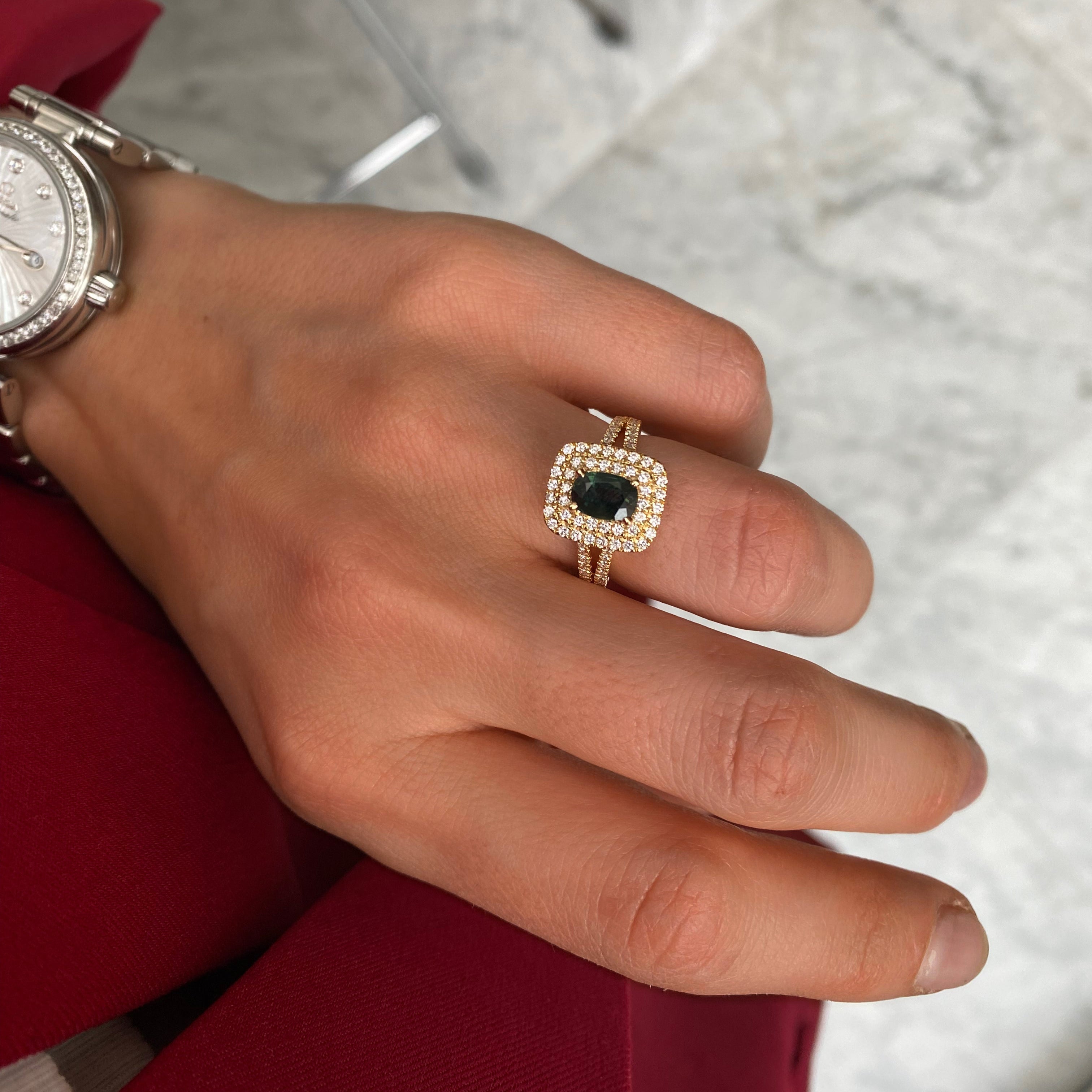18K geelgouden ring met natuurlijke, groene saffier van 1.16 ct en natuurlijke diamanten van 0.59 ct (7x5mm)