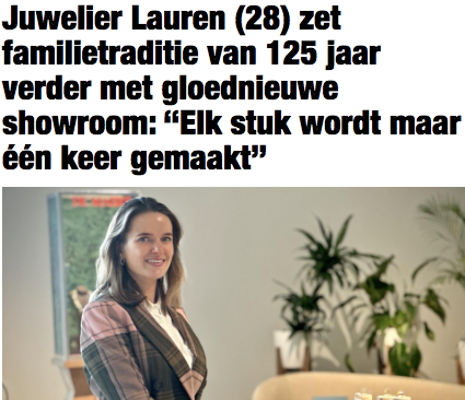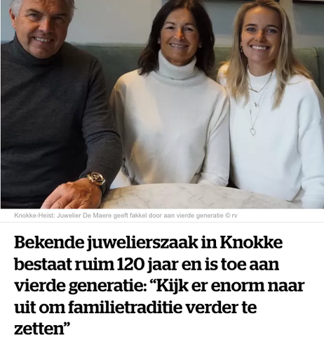 "Juwelier De Maere, opgericht in 1899, sluit de fysieke winkel en geeft de fakkel door aan de vierde generatie. Lauren De Maere (25) treedt in de voetsporen van haar overgrootouders, die ruim 120 jaar geleden startten met een juwelierszaak. Lauren De Maere bouwt verder op de jarenlange expertise van de familie, maar focust vooral op de online verkoop."